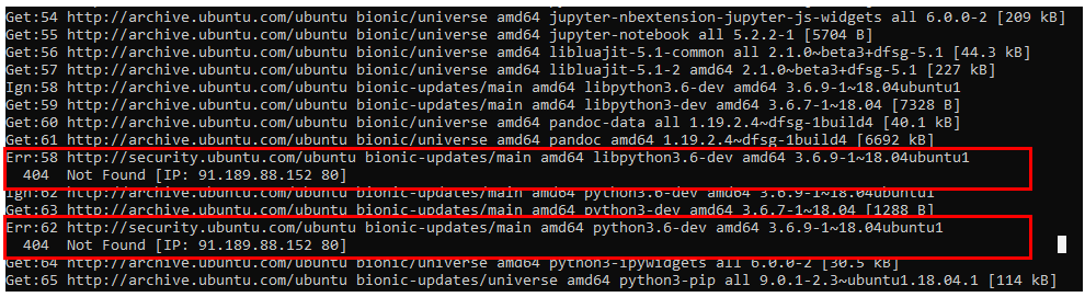 - Err:58 http://security.ubuntu.com/ubuntu bionic-updates/main amd64 libpython3.6-dev amd64 3.6.9-1~18.04ubuntu1