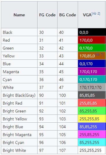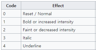 - ASNI 코드가 구현 가능한 글자 표현, 색, 여러 기호 등에 관한 자세한 사항은 다음 링크 참조