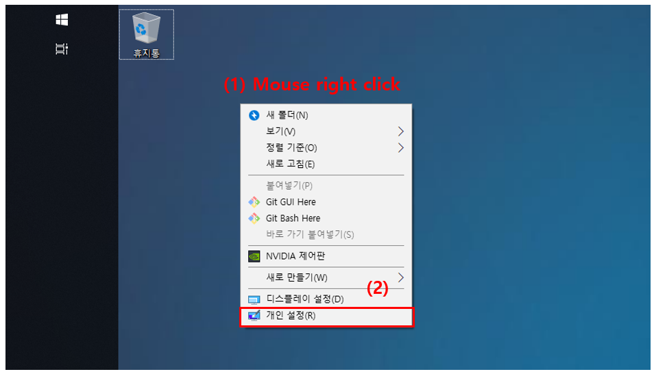 - 바탕화면에서 우클릭 -> 개인 설정 -> 테마 -> 바탕 화면 아이콘 설정
