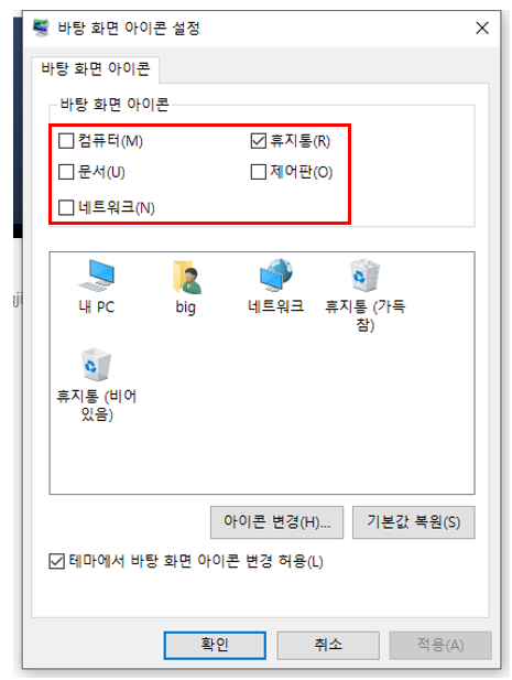 - 표시를 원하는 아이콘 체크 활성화 후 확인/적용
