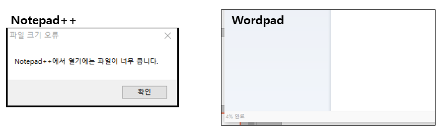 - 일반적인 텍스트 에디터로 실행하려고 하면 너무 대용량이라 실행 불가능 하거나, 읽는 데 과도한 시간 소요