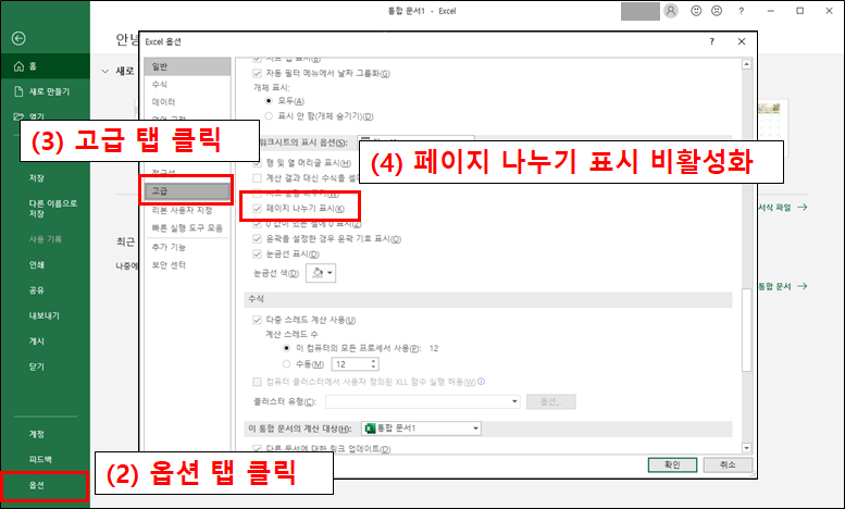 - 파일 탭 클릭 - 옵션 탭 클릭 - 옵션 창의 고급 탭 클릭 - 페이지 나누기 표시 비활성화