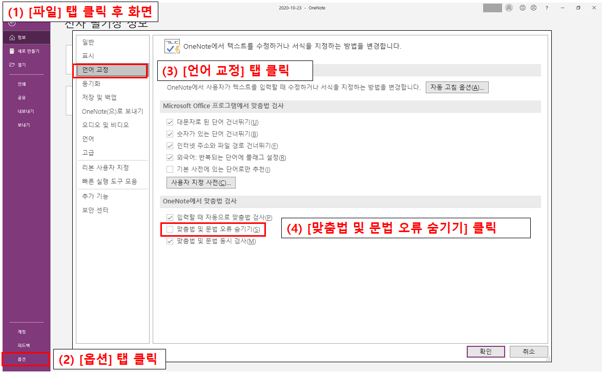 - [파일] 탭 클릭 - [옵션] 탭 클릭 - [언어 교정] 탭 클릭 - [맞춤법 및 문법 오류 숨기기]