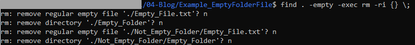 | * 명령어 >> find [경로] -empty -exec rm -ri {} \; |