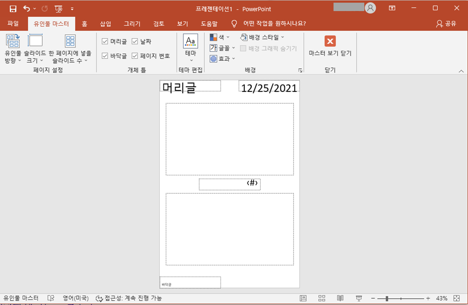 아래와 같이 파워포인트의 유인물 마스터 기능은 피피티 파일이 인쇄될 때 모양을 설정할 수 있는 기능입니다.
