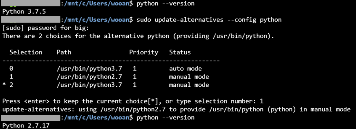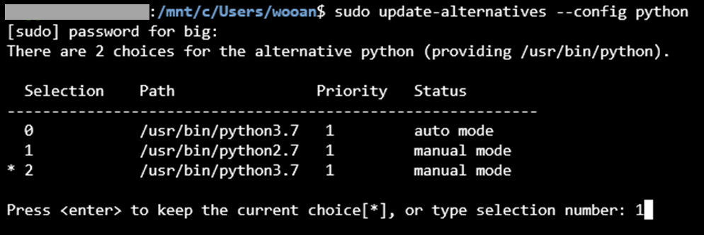 - 예를들어 python 의 기본버전을 바꾸고 싶으면, 아래 그림과 같이 명령어를 입력한 뒤, 원하는 버전(기본 경로)에 해당하는 번호를 입력하면 됩니다.
