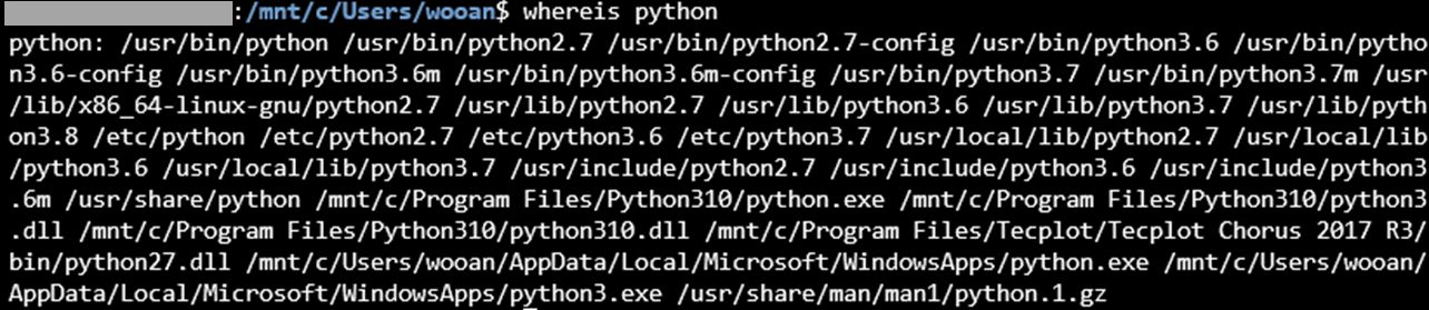 - 아래 명령어를 통해 시스템에 설치된 파이썬이 뭐가 있는지 확인해 봅시다. 저는 여기저기 버전이 많네요.