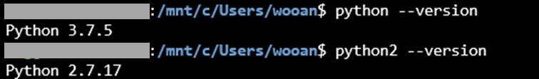 - 예를 들면, 최신 파이썬 버전이 아니라 파이썬 2 버전을 사용하고 싶으면 $ python ... 대신 $ python2 ... 와 같이 파이썬 버전을 지정해 주면 됩니다.