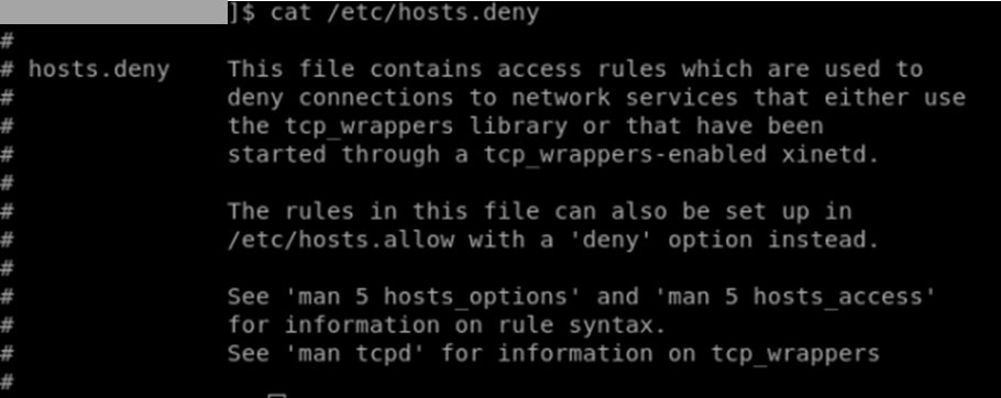 - /etc/hosts.deny 파일에는 원격접속을 제한하는 IP나 호스트 이름을 적을 수 있는데, 혹시 이 파일에 본인의 IP나 호스트 이름이 적혀 있다면 지워줍니다.