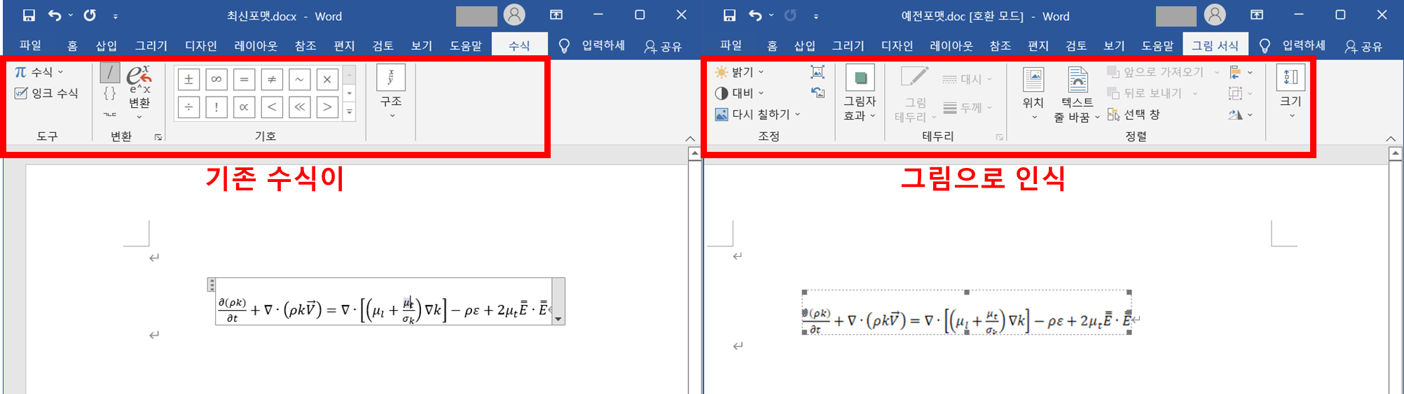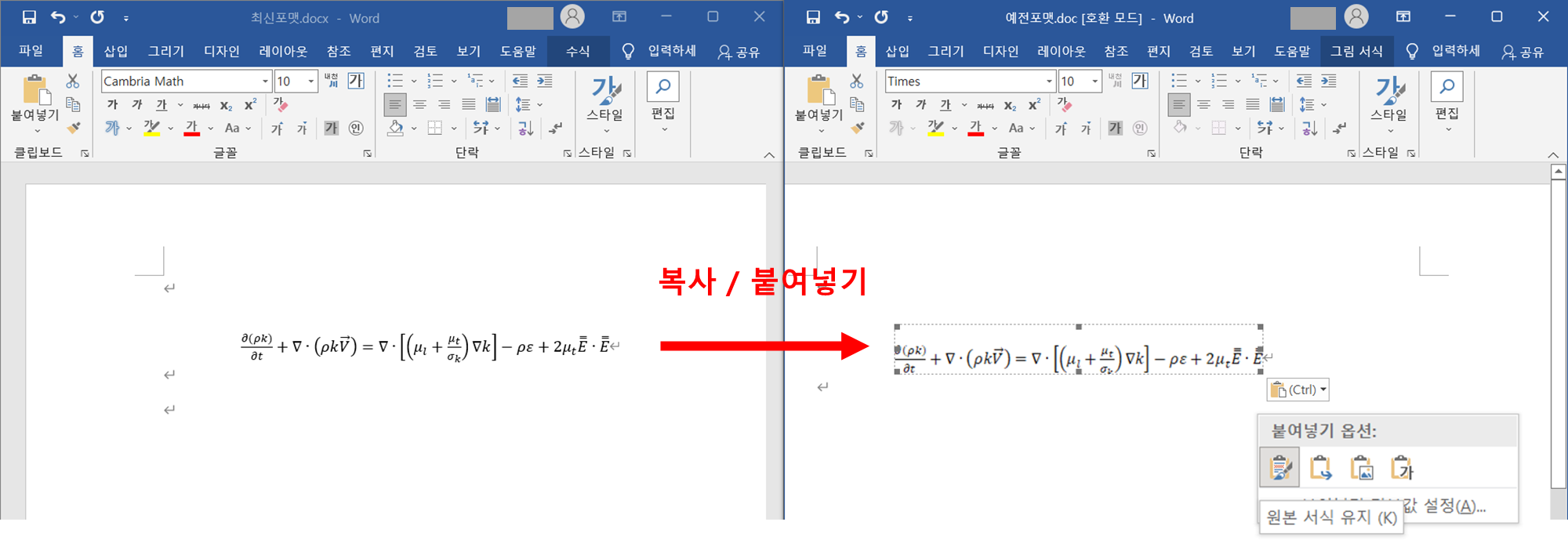 다만, 최신 포맷 (.docx)에서의 수식을 예전 포맷 (.doc)로 복사/붙여넣기 할 때에는 예전 포맷이 수식을 수식으로 인식하지 못하며, 따라서 수정도 못하게 됩니다.