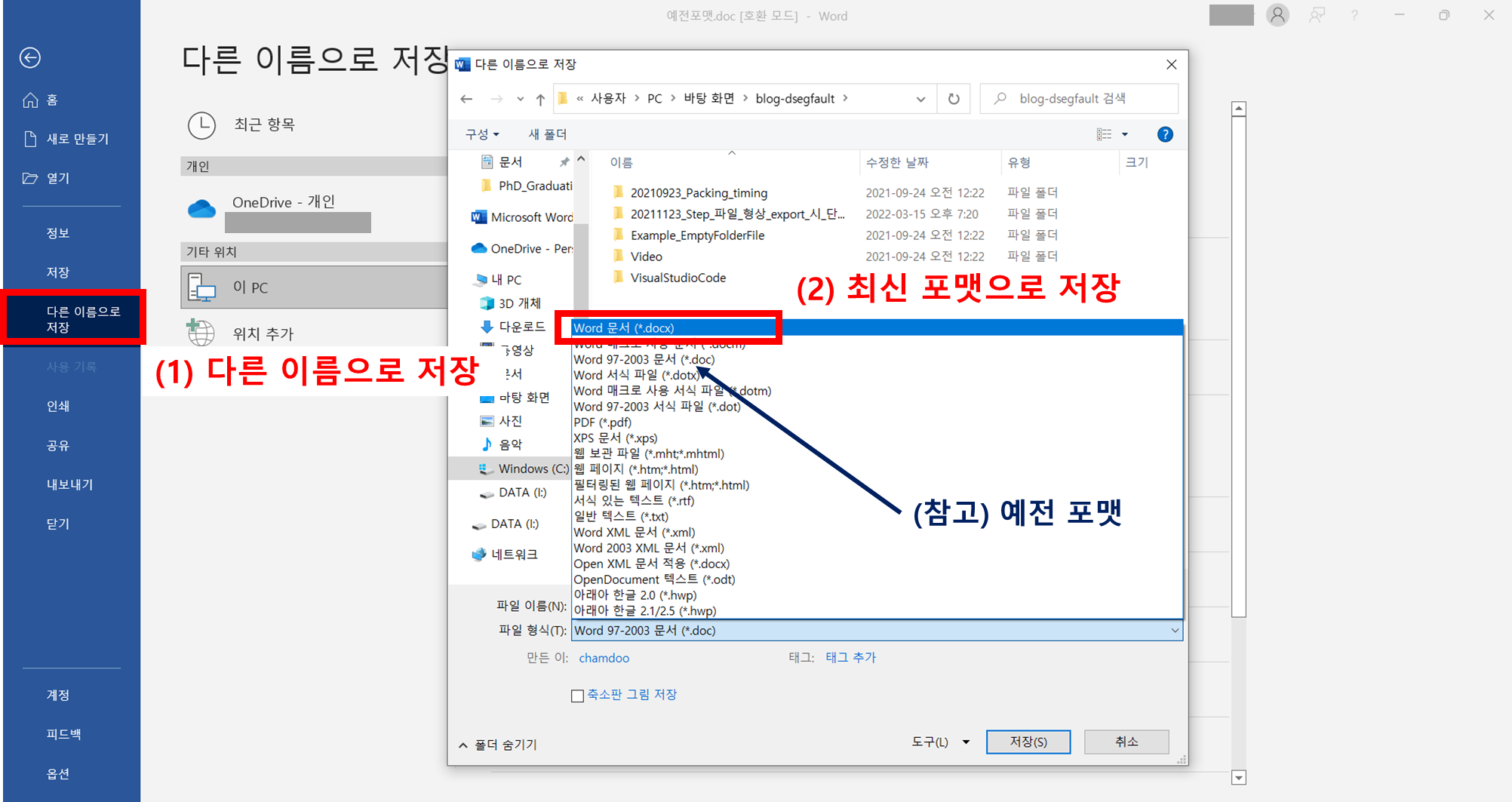 | 3 | 파일 형식을 기존 Word 97-2003 문서 (.*doc) 에서 --> Word 문서 (*.docx) 로 변경 |