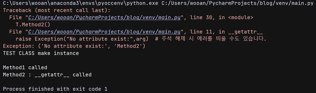 - 아래 코드에서 확인할 수 있듯이, Method2는 정의되지 않았기 때문에 __getattr__이 호출됩니다.