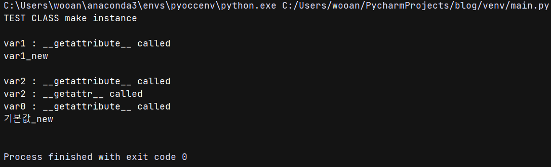 * 정의되지 않은 var2는 (1) 맨 처음 __getattribute__ 를 거쳐서 "var2_new"가 되었지만, (2) 그럼에도 속성을 찾지 못해 __getattr__을 거쳐 var0인 "기본값"으로 할당되고, (3) 다시 __getattribute__ 를 거쳐 "기본값_new"가 되었습니다.