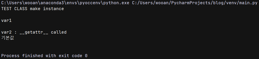 * 코드와 같이 __getattr__ 에서 정의되지 않은 변수를 var0인 "기본값" 으로 할당해서 return 해 줍니다.