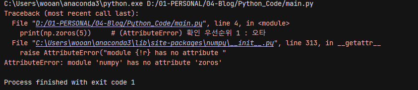 print(np.zoros(5)) # (AttributeError) 확인 우선순위 1 : 오타