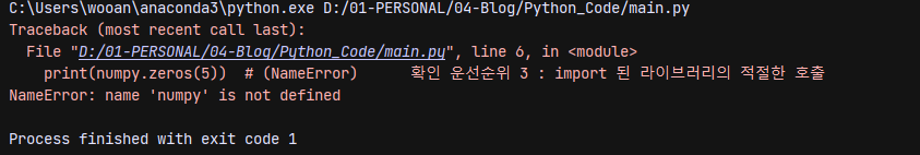 print(numpy.zeros(5)) # (NameError) 확인 운선순위 3 : import 된 라이브러리의 적절한 호출