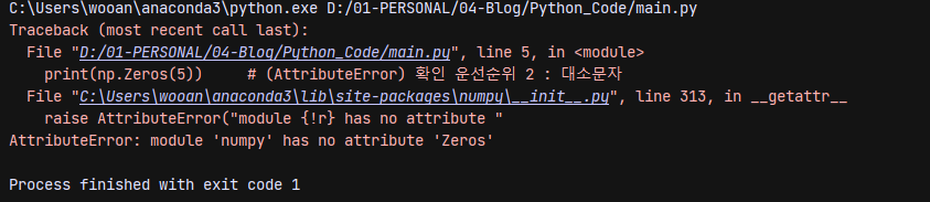 print(np.Zeros(5)) # (AttributeError) 확인 운선순위 2 : 대소문자