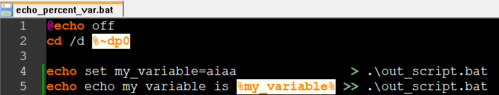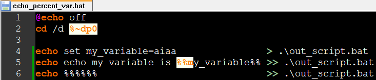 %변수이름% 문자 그대로를 echo를 통해 batch script로 쓰고 싶다면, %%변수이름%% 으로 사용하고,