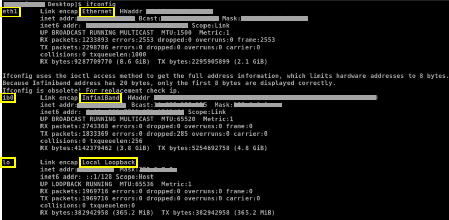 eth1으로 표시된 이더넷 아이피, ib0로 표시된 인피니밴드 아이피, lo로 표시된 루프백 아이피가 존재합니다.