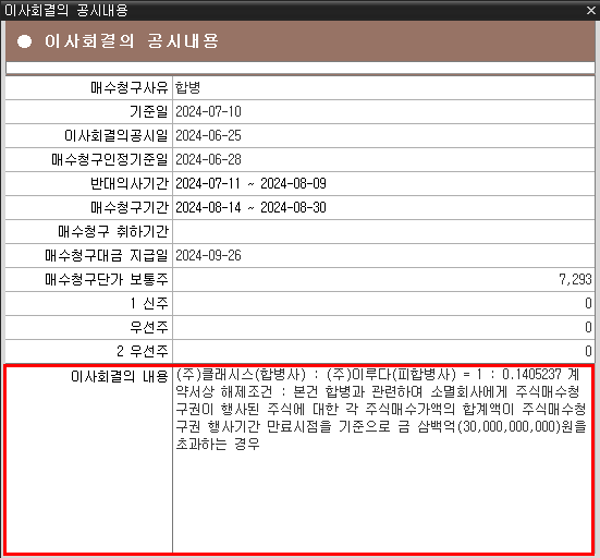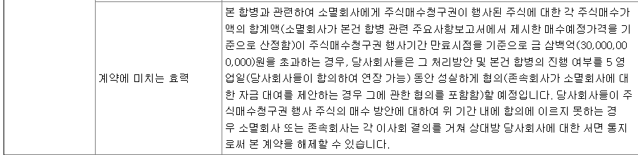 아래와 같이 주식 매수청구 합계액이 300억원을 넘을 경우에는 계약 해제를 할 수 있기 때문에 확정적으로 주당 7,293원에 매수청구가 이뤄지지 않을 수 있습니다.