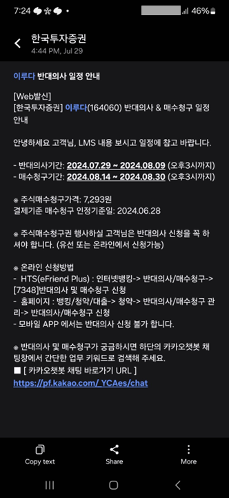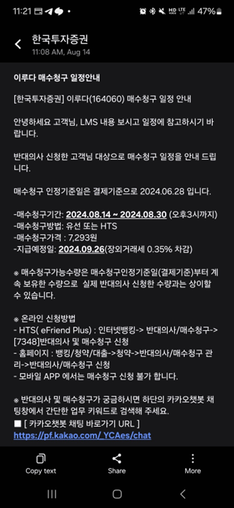 매수청구 기간이 되자마자, 증권사에서 아래와 같이 카톡 메시지가 왔습니다.