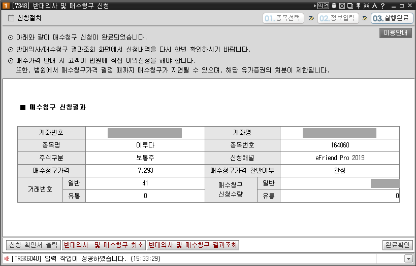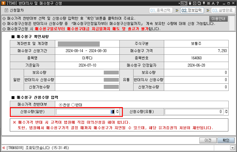 안내대로 PC를 켜고 HTS를 들어가면, 반대의사 및 매수청구 신청 창이 있습니다.