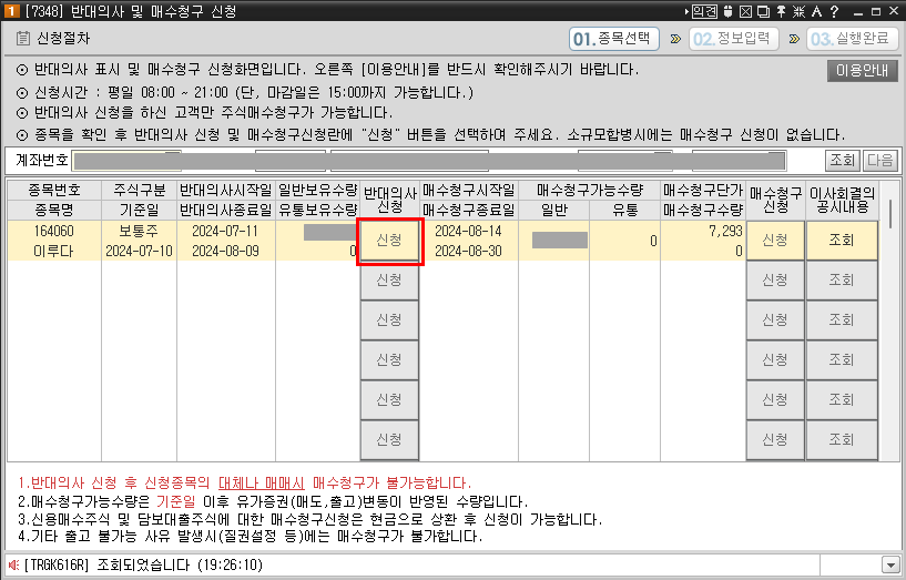 HTS 로그인 - 인터넷뱅킹 - 반대의사/매수청구 - [7348] 반대의사 및 매수청구 신청