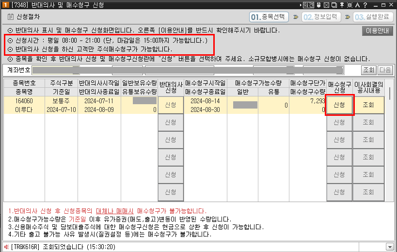 주의사항은 (1) 신청 시간이 있다는 것이고, (2) 반대의사 신청하신 분들만 주식매수청구가 가능하다는 것입니다. (아래 그림 빨간 박스 참조)