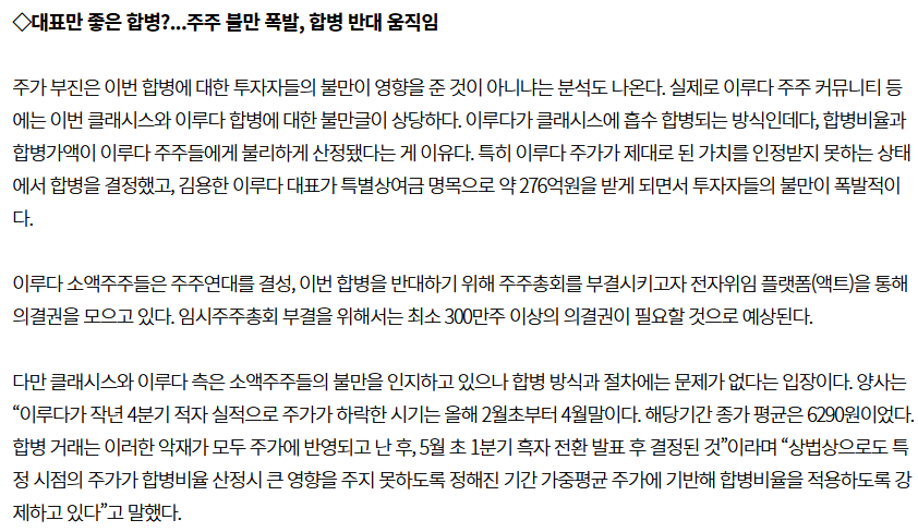 앞선 배경에서도 언급했었지만, 합병비율이 이루다에게 너무 불리한 것 아니냐는 불만의 목소리들이 많았었죠.