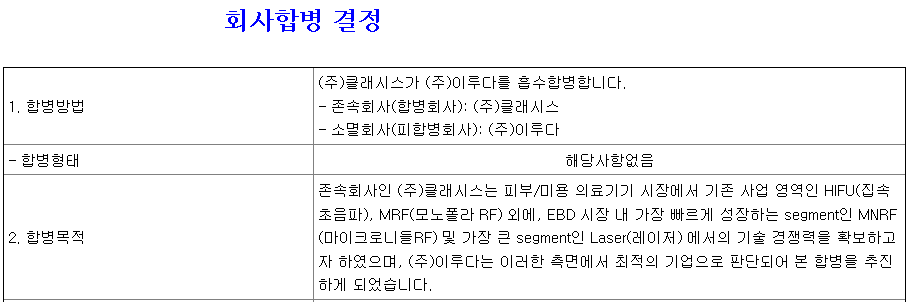 회사 합병을 결정했고, 클래시스가 이루다를 흡수합병 한다고 합니다.