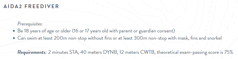 프리다이빙 AIDA2 자격증은 다음을 통과해야한다.