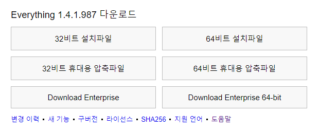 Everything 실시간 파일/폴더 검색 작은 설치파일 깔끔하고 단순한 UI 빠른 파일 색인 빠른 검색 최저 자원 사용 쉬운 파일 공유 실시간 갱신 등등... Everything 1.4.1.992 다운로드 32비트 설치파일 64비트