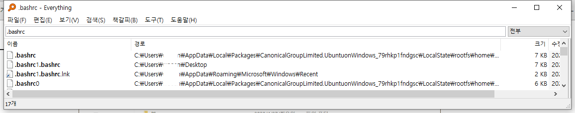 Everything 등 검색 프로그램을 이용, Linux 홈 폴더에 default로 존재하는 ".bashrc" 파일 등을 검색하는 방식으로도 경로를 찾을 수 있다.