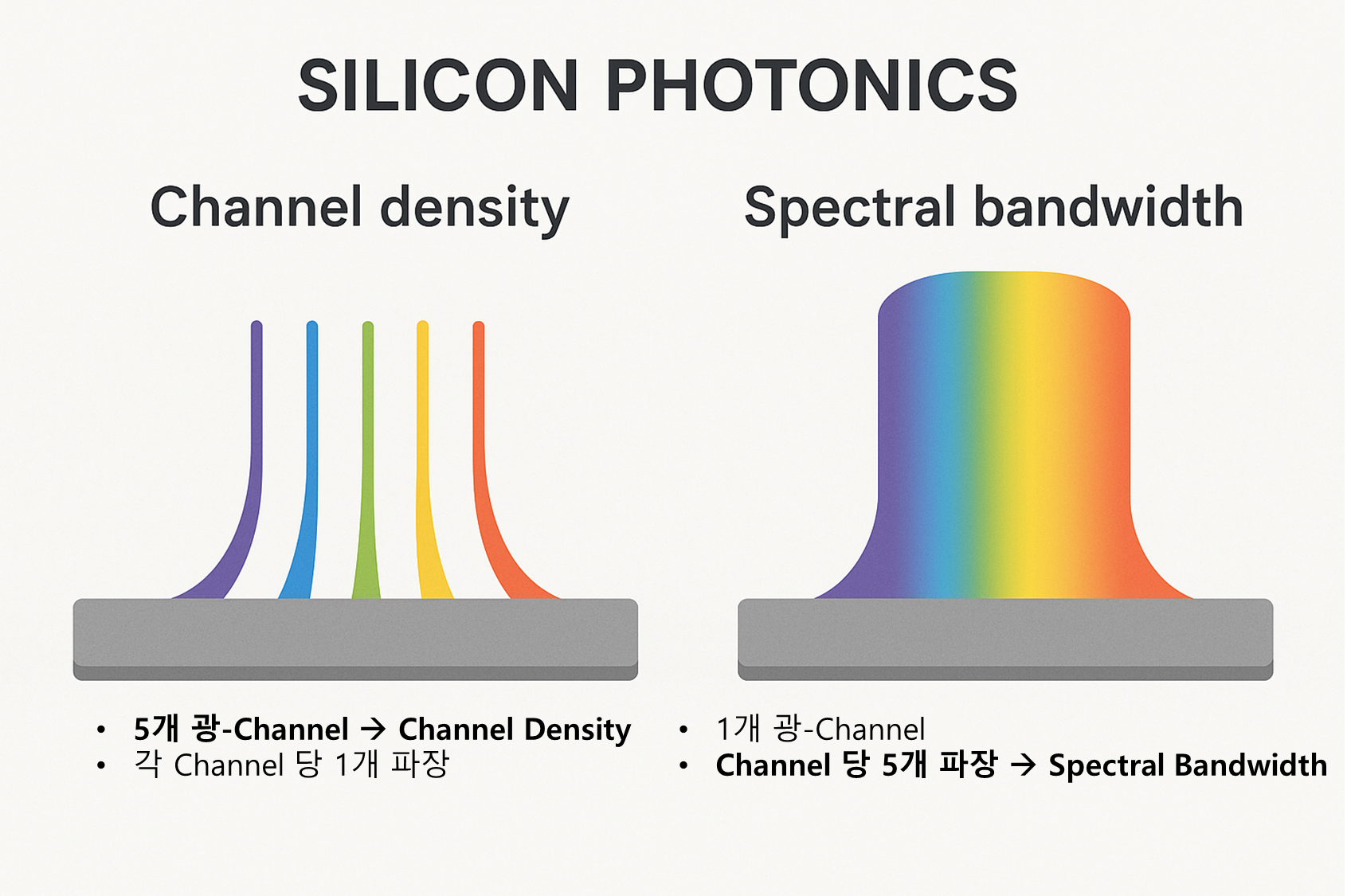 | 멀티 채널 (Multi-channel / Channel density) | 독립적인 광 경로의 개수 | 여러 광 신호를 물리적으로 병렬 처리 | 칩에 광섬유 여러 개 붙여서 각각 다른 신호 전달 |