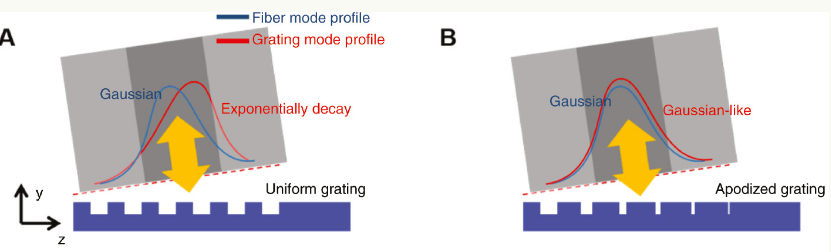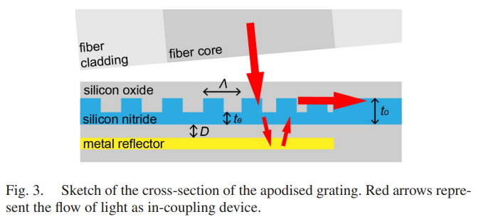 - 아래 그림은 방향성에 향상을 위한 Apodization은 아니지만, Beam mode profile을 Fiber와 G/C간에 잘 매칭시키기 위해서 (효율 향상에 중요) Apodization을 활용