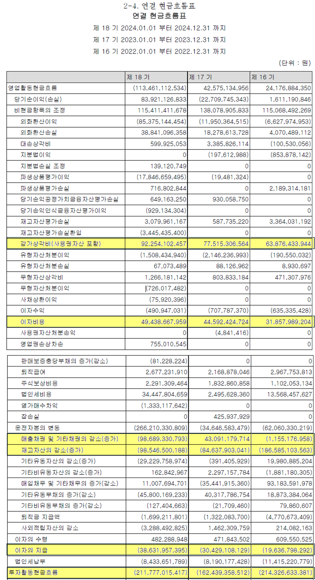 재고자산도 많이 쌓아두고, 매출채권도 많이 증가했네요.
