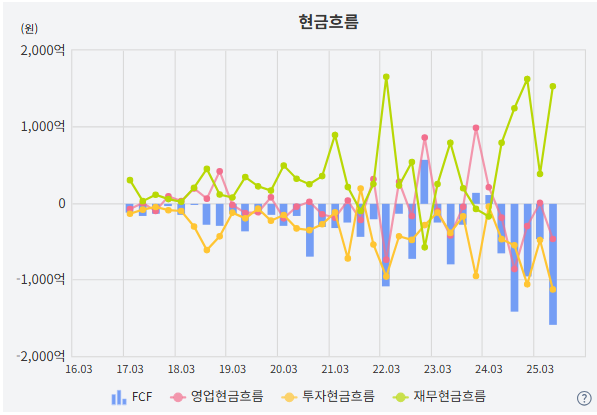 투자를 많이 하니 어쩔수 없을까요? 투자나 재무 현금흐름을 그렇다 치더라도, 영업활동현금흐름도 플러스가 아닙니다.